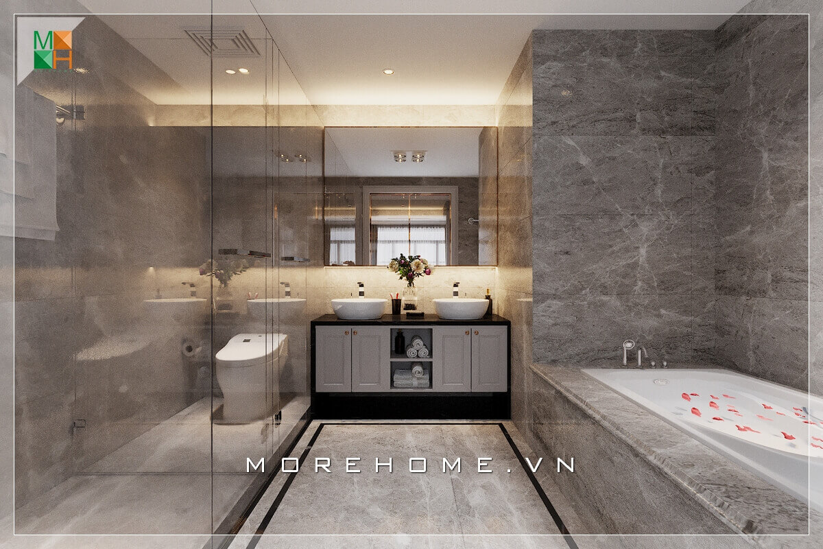 Mẫu thiết kế phòng tắm master với không gian nội thất vô cùng cao cấp, được bố trí khoa học với khu lavabo ở giữa, hai bên là khu vệ sinh và khu tắm được ngăn cách bằng kính cường lực giúp hạn chế nước bắn để sàn nhà luôn được khô ráo sạch sẽ
