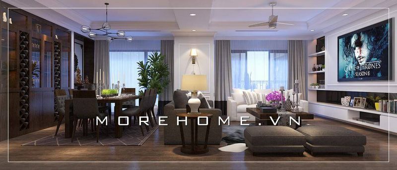 Phòng khách căn hộ chung cư diện tích nhỏ vừa sang trọng vừa tiện nghi, thoáng đãng với thiết kế sofa hiện đại dáng văng gọn gàng từ gỗ óc chó cao cấp.