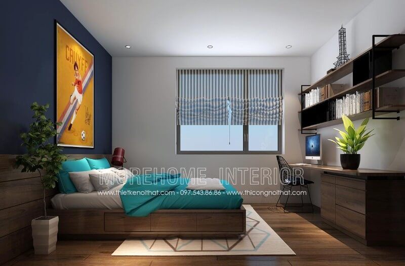 Không gian nghỉ ngơi đơn giản với mẫu giường gỗ công nghiệp, đầu giường được ốp gỗ cao cấp màu hạt dẻ tạo cho không gian thêm ấm áp