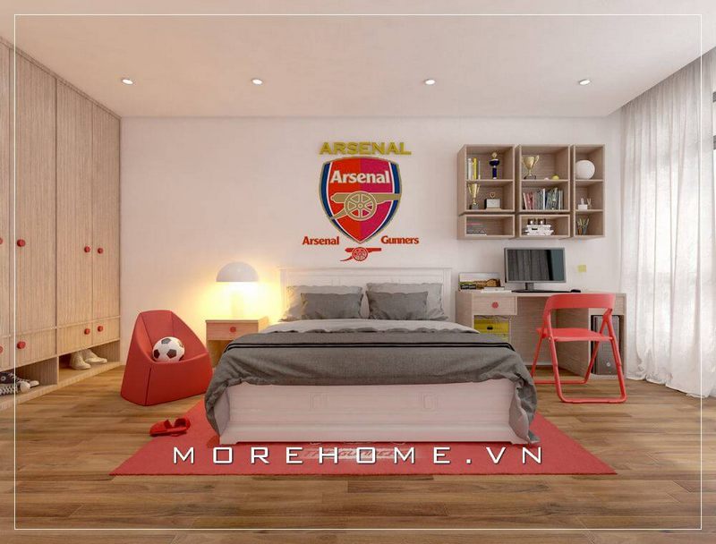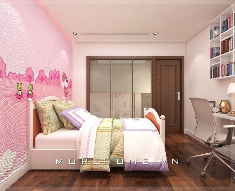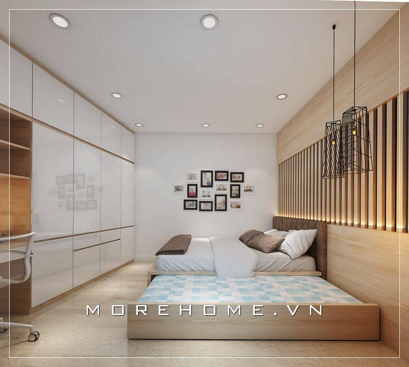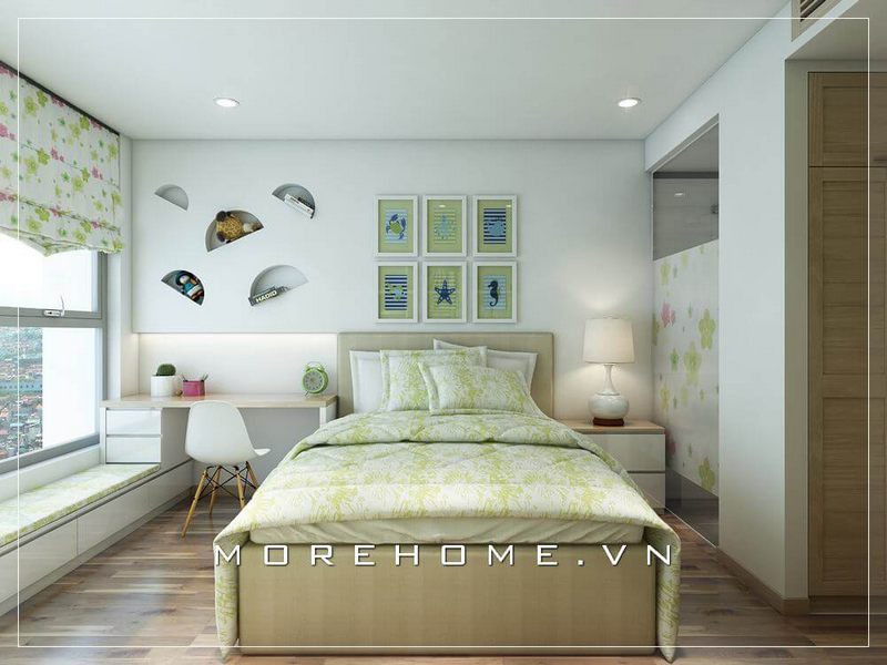 Nội thất phòng ngủ gỗ công nghiệp nhẹ nhàng với giường ngủ kiểu dáng thấp được gia chủ lựa chọn cho phòng ngủ của con