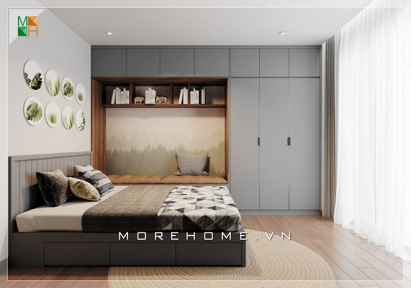 Chiếc giường ngủ độc đáo được thiết kế liền kề với khu vực cửa sổ giúp cho căn phòng luôn tràn ngập ánh sáng tự nhiên