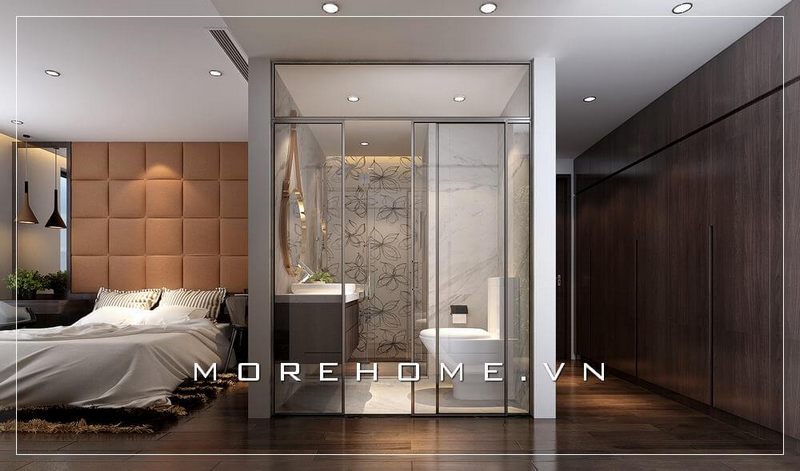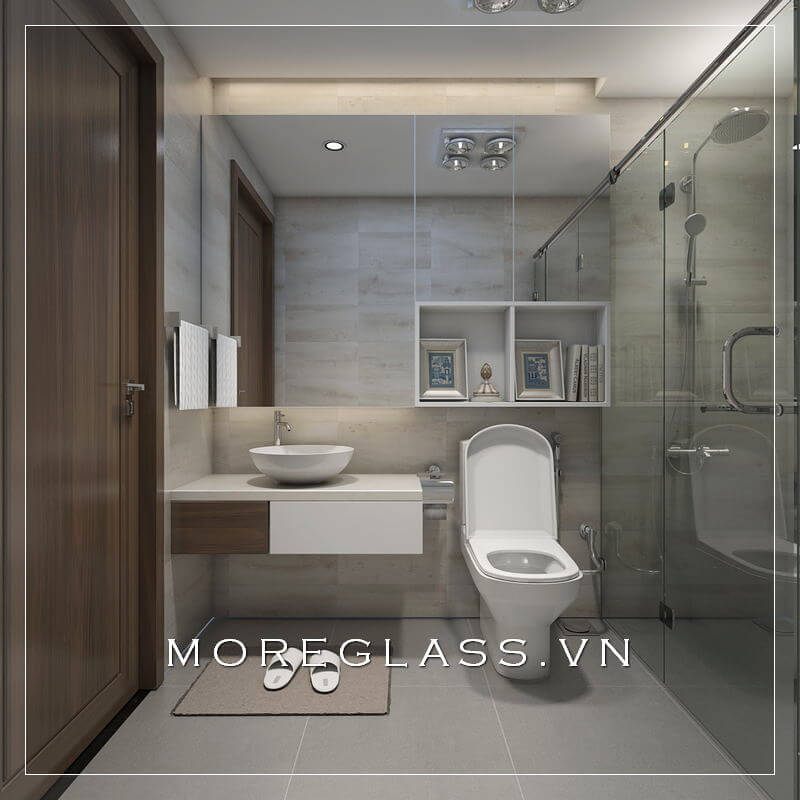 Mẫu thiết kế nhà vệ sinh hiện đại của chung cư đã kết hợp với phòng tắm kính cường lực cao cấp, giúp tạo ra không gian tiện nghi và thoải mái mà không bị chật trội.