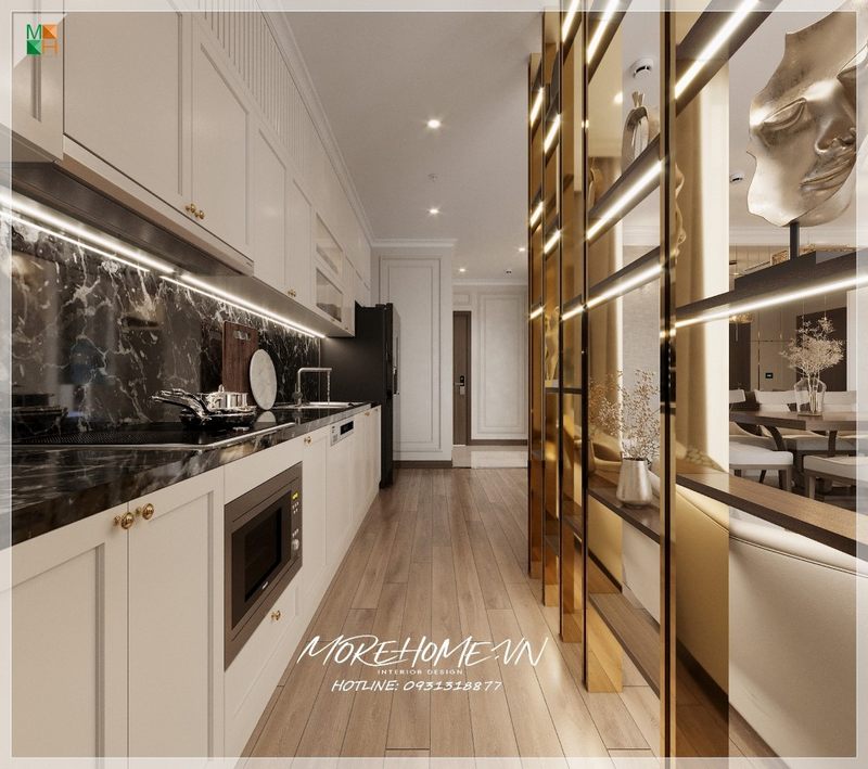 Trang trí nội thất phòng bếp của chung cư bằng chất liệu gỗ công nghiệp.